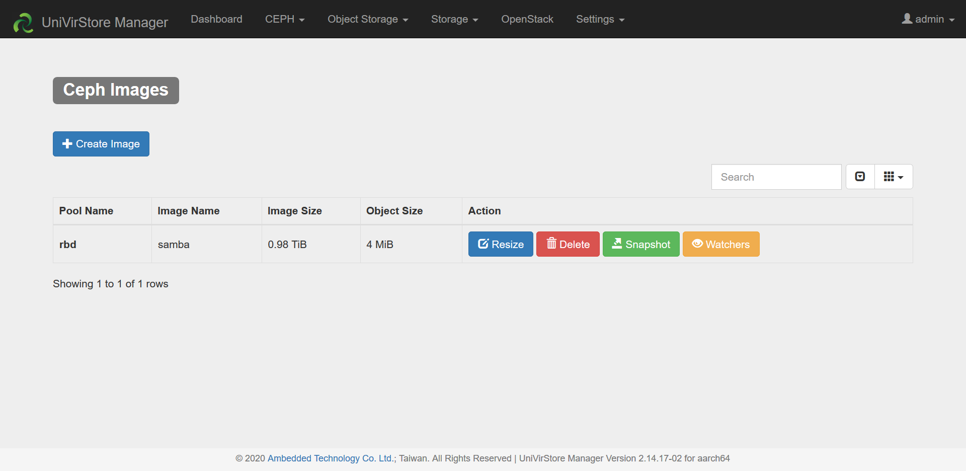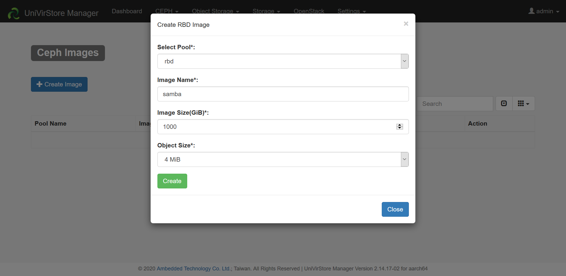 1-2. Select the menu "CEPH" -> "Images" Create an image "samba".