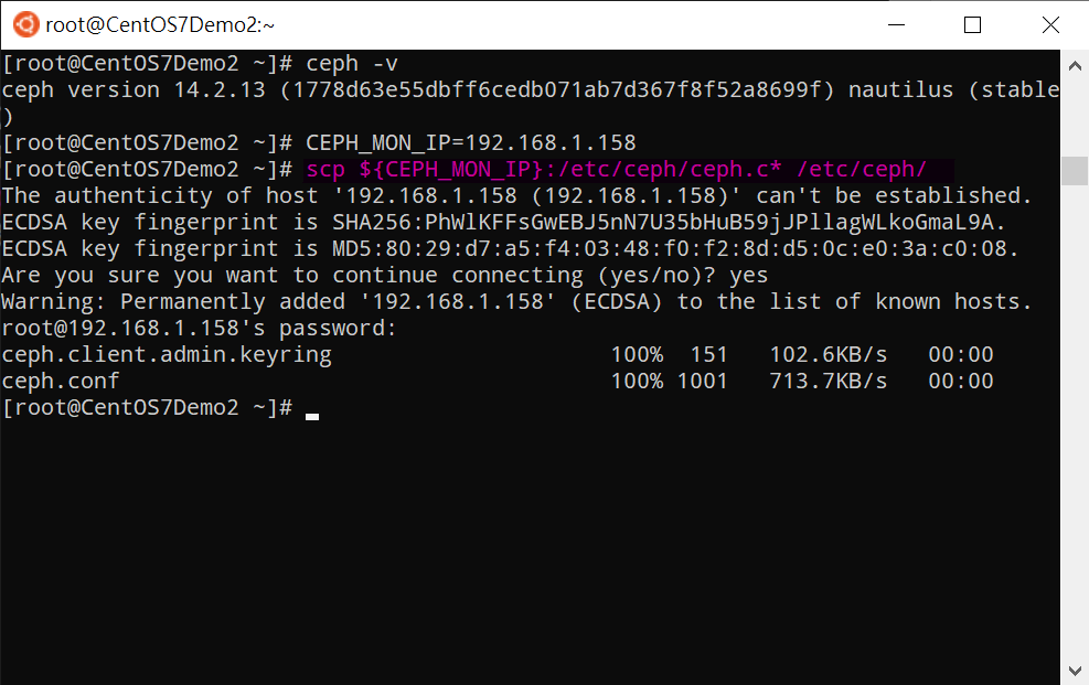 $ scp ${CEPH_MON_IP}:/etc/ceph/ceph.c* /etc/ceph/