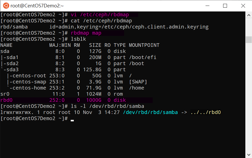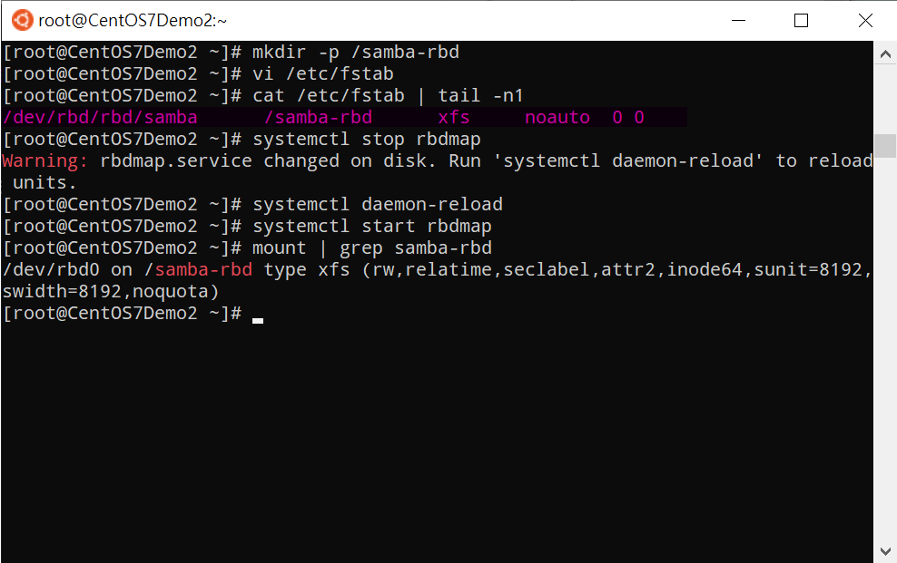 /dev/rbd0 on /samba-rbd type xfs (rw,relatime,seclabel,attr2,inode64,sunit=8192,swidth=8192,noquota)