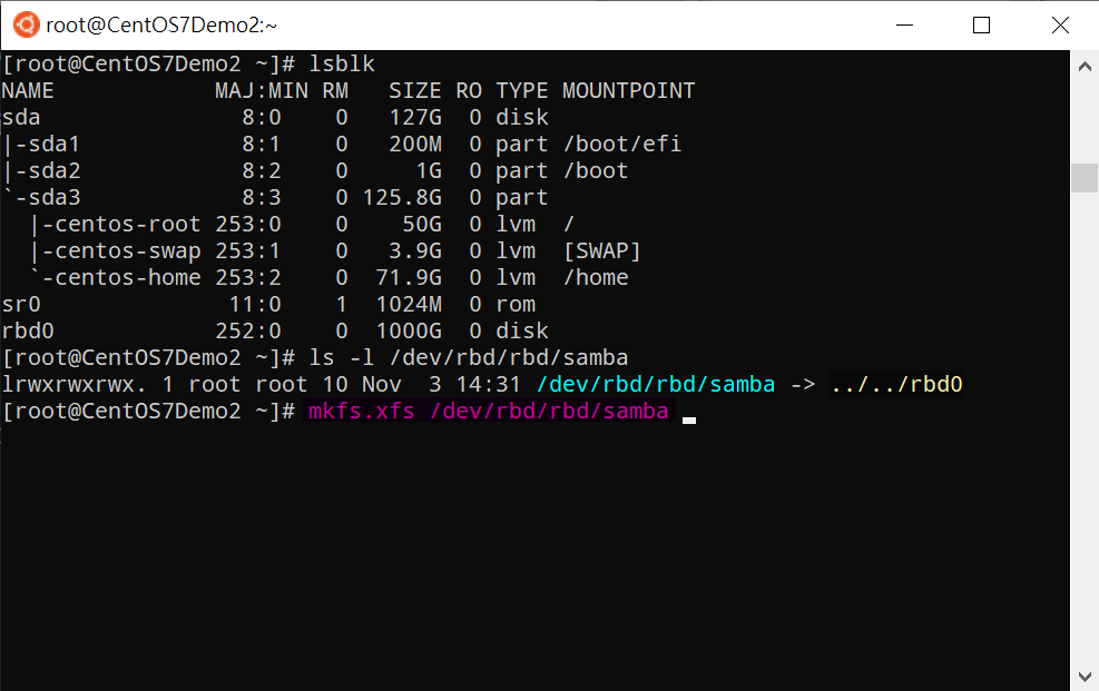 $ mkfs.xfs /dev/rbd/rbd/samba